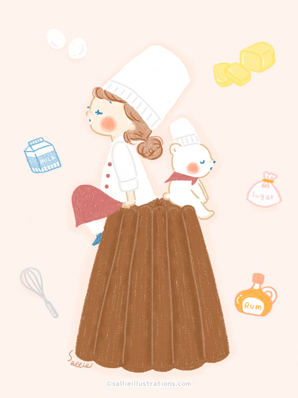 カヌレ作り 2026年1月16日 最終更新日時 : 2026年1月24日 info@sallieillustrations.com 「ふぅ。やっとかたちになったね〜!」カヌレ作りは難しい〜(2025 / Photoshop, Colored Pencils)